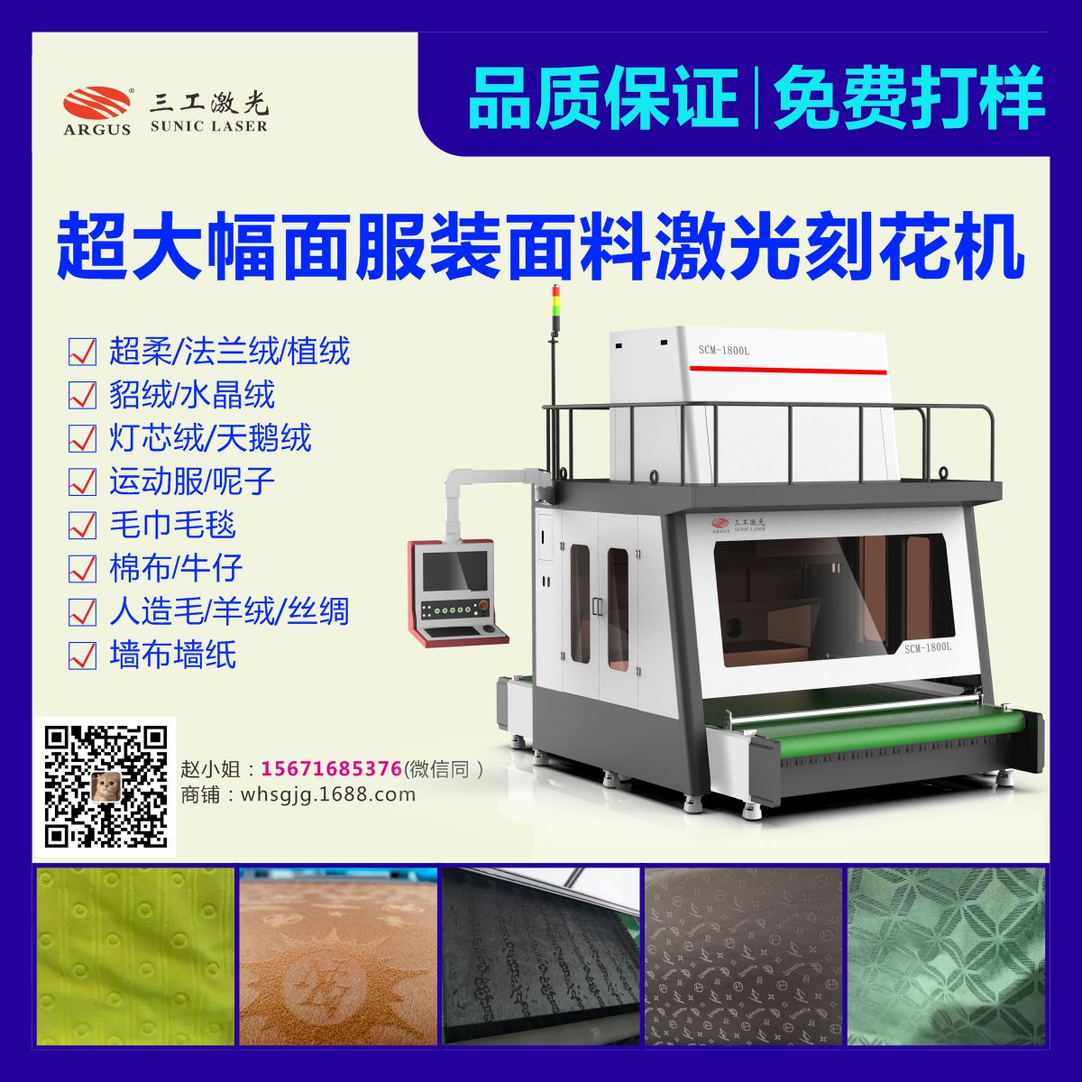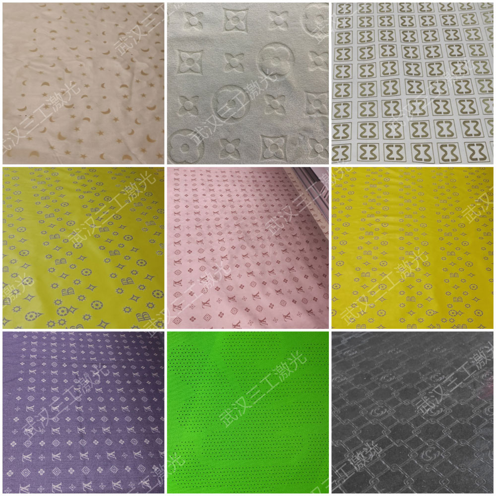 該設(shè)備是利用激光的熱效應(yīng),無接觸的對(duì)面料進(jìn)行燒灼刻蝕,并形成凸凹有致的花型圖案。
